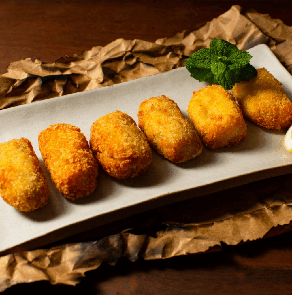 Fatias de pão baguete cobertas muçarela, salmão grelhado, cream cheese e parmesão.