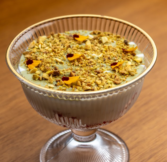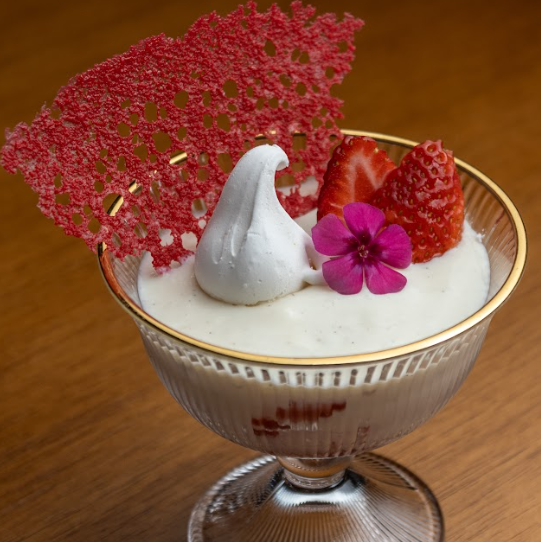 Morangos, creme de baunilha, creme de pistache e pistache tostado.